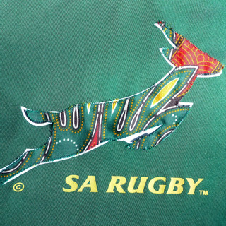 The T-shirt was an official South African Supporter T-shirt. I redecorated it by appliqué-ing a Shweshwe Springbok over the original Springbok printed on the T-shirt. I also added Shweshwe detail to the sleeves and a tiny piping effect in the seam of the T-shirt's shoulders.