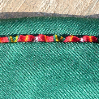 The skirt is a simple pleated skirt. The pleats work with the pattern on the cloth. The size of the pleats is specially calculated to fit with the pattern. The edge of the cloth had the red and yellow border which I left unhemmed.